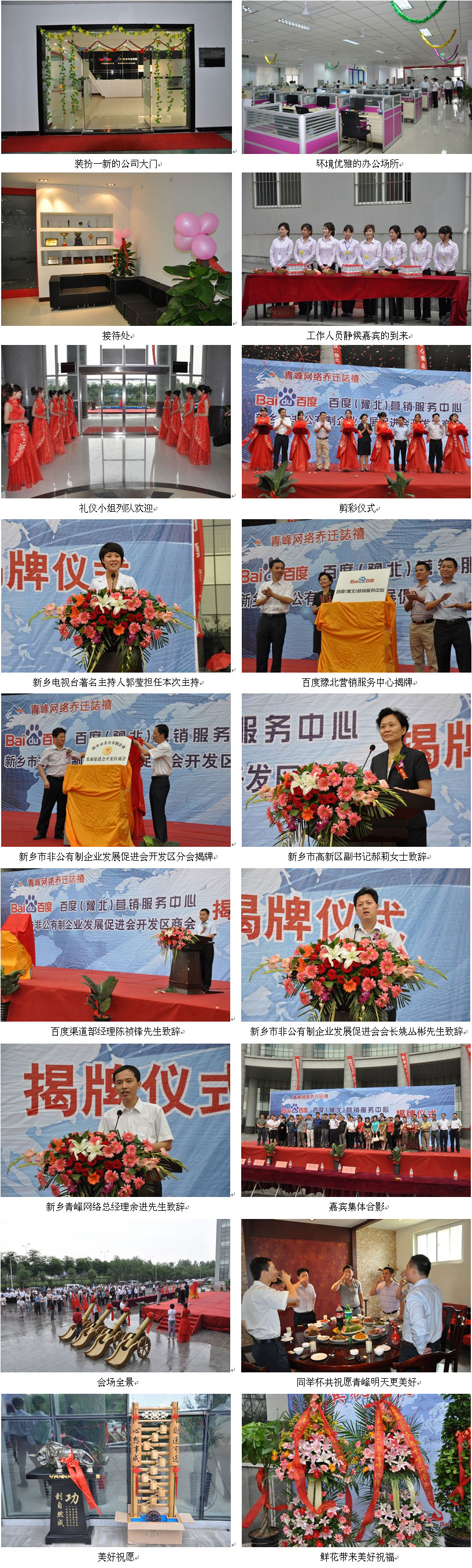 6月25日上午11時,百度(豫北)營銷服務中心、新鄉市非公有制企業發展促進會開發區商會揭牌儀式暨青峰網絡科技有限公司喬遷儀式在新鄉市開發區火炬園隆重舉行。新鄉市高新區副書記郝莉女士、百度渠道部經理陳禎鋒先生、百度高級渠道經理蘇實先生、新鄉市非公有制促進會會長姚叢彬先生、青峰網絡合作伙伴和全體員工共二百多人參加大會。