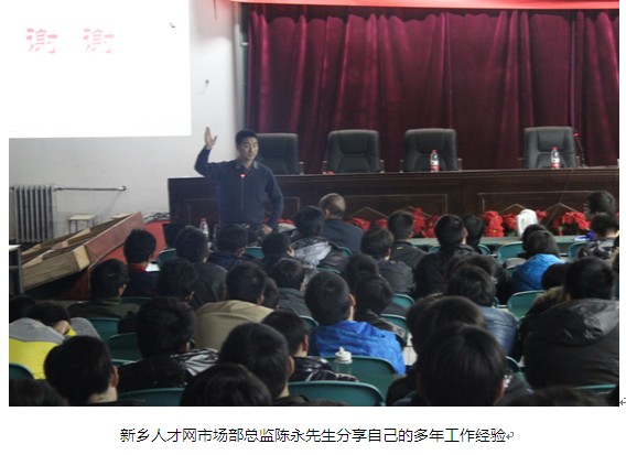 新鄉(xiāng)人才網(wǎng)市場部總監(jiān)陳永先生幫助即將步入職場的學子們了解目前嚴峻的就業(yè)形勢,針對這種形勢如何做到揚長避短,選擇到一個合適的公司與職位。陳總與同學們分享了理想與現(xiàn)實、就業(yè)與擇業(yè)、付出與回報等同學們關心的話題,使同學們在將來的職場生涯中少走彎路,與成功更近一步。