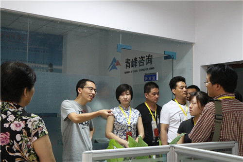 在公司CEO余進先生、行政部經理付士奇先生的帶領下,朱會長及會員們參觀了青峰網絡的所有辦公場所及旗下子公司。在參觀過程中,余總向大家介紹了公司的發展歷程和公司生態鏈,著重講解了公司文化和各項福利政策,朱會長及會員們表現出極高的興趣和贊同。